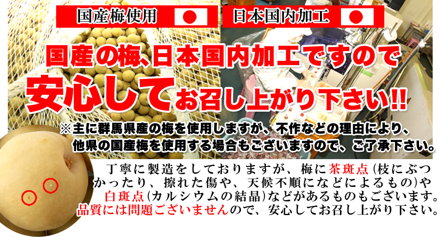 国産100%の梅を使い、国内で製造するのがこだわりです!収穫した直後から美味しさが損なわれる梅の実ですから、国内産を国内で仕上げることで美味しさを閉じ込めています。自然の恵みですので、梅の実に斑点や擦り傷などがつくことがあります。予めご了承ください。品質や美味しさには一切問題ありませんので、安心してお召し上がりください!