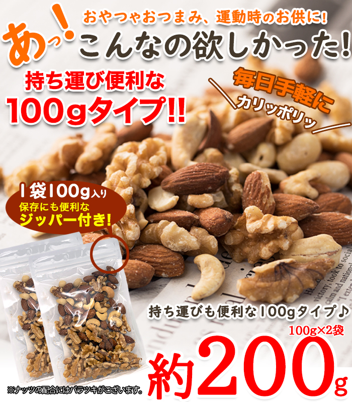 自宅ではもちろん、職場やお出かけなどに持ち運べるよう、ジッパー付きの袋に入れた100gを2袋、合計200gたっぷりとお届けします。ジッパー付きの袋に入っていますので、保存性も携帯性もバツグン!毎日の習慣に少しのナッツを取り入れてみませんか?