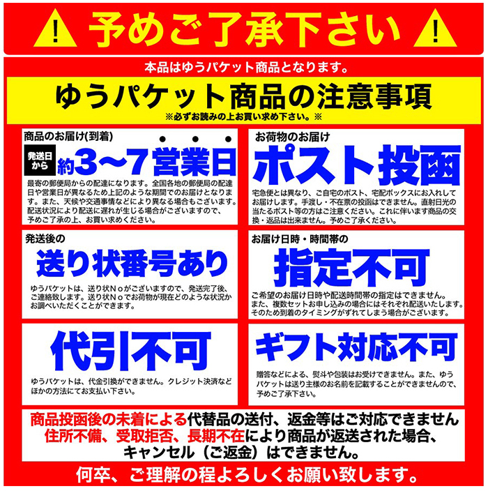 ・商品投函後の未着による代替品の送付、返金等はご対応できません。
