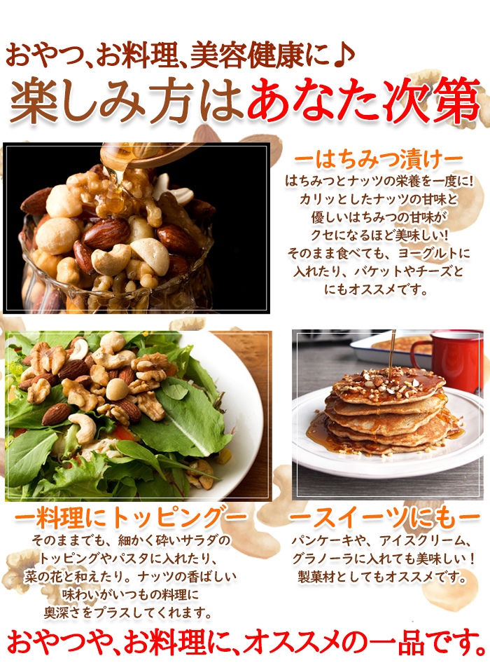 そのまま食べてもいいですし、ヨーグルトのトッピング、バゲットにクリームチーズを塗ってナッツのはちみつ漬けをトッピングしても