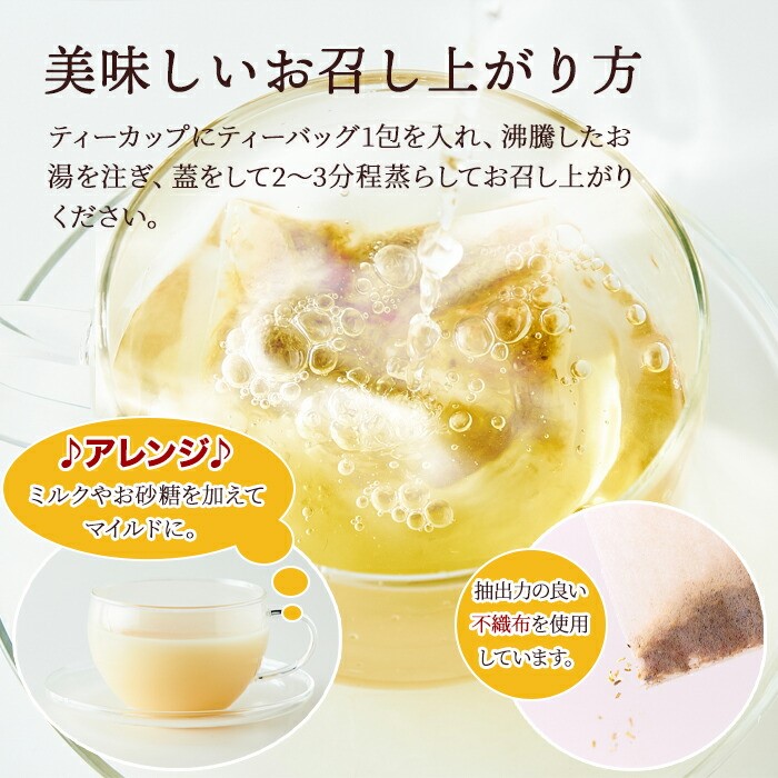 美味しいお召し上がり方として、ティーカップにティーバッグ1包を入れ、そこに沸騰したお湯を注ぎ、